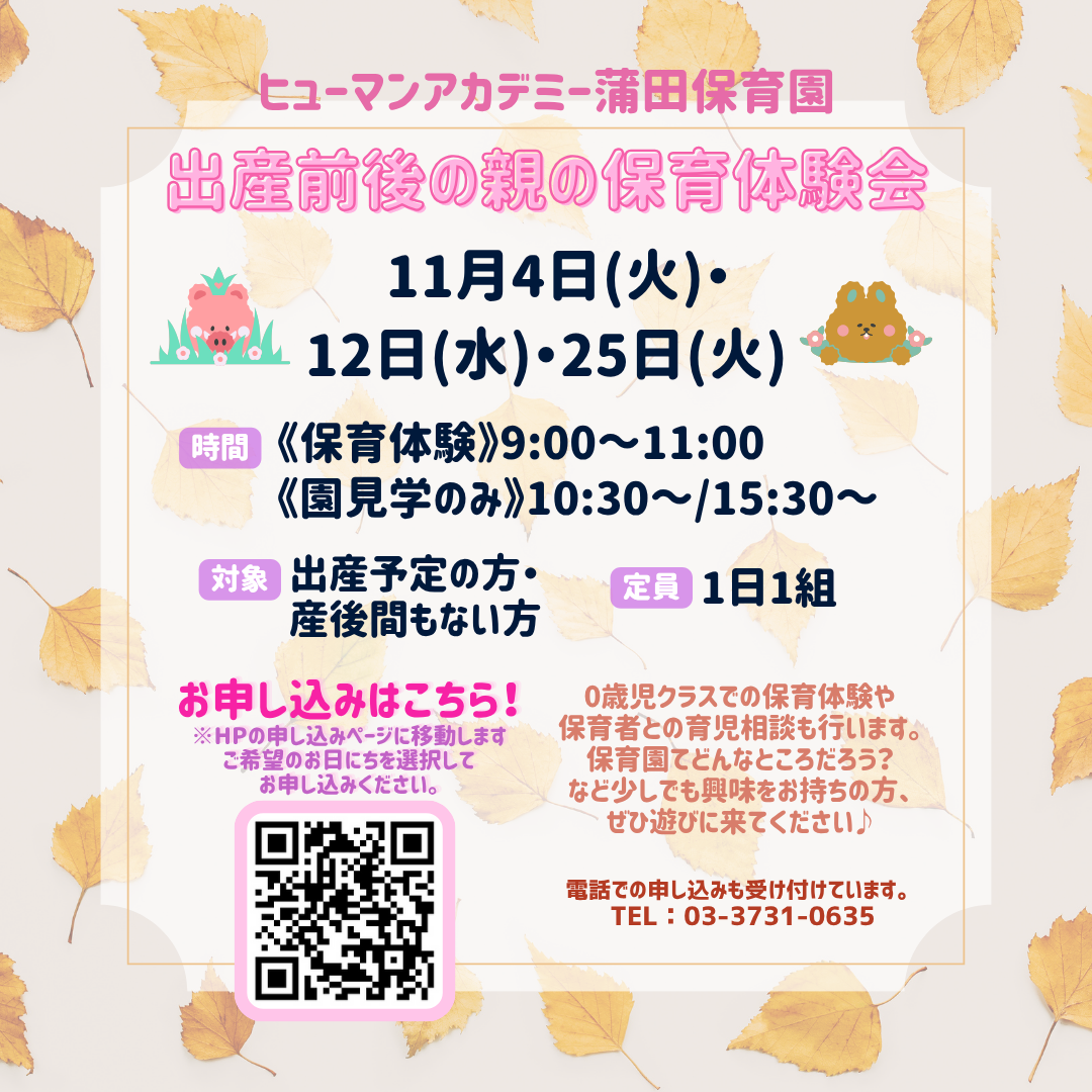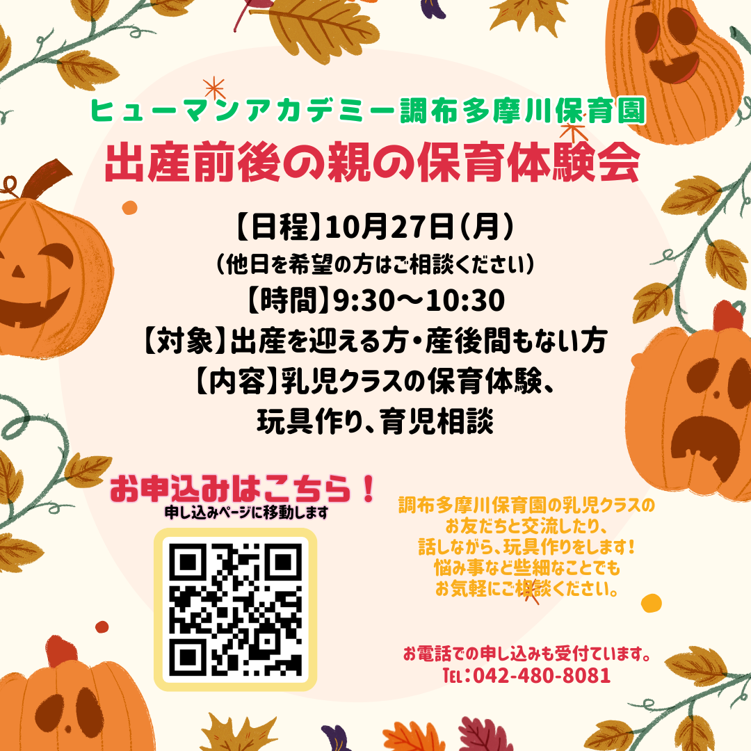 ヒューマンアカデミー調布多摩川保育園より出産を迎える方や産後間もない方対象の保育園体験&育児相談会のお知らせです。