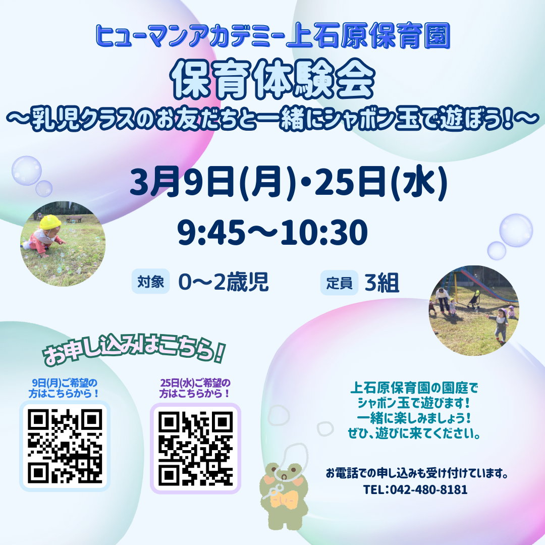 ヒューマンアカデミー上石原保育園より~乳児クラスと一緒に遊ぼう♪シャボン玉遊び~のお知らせです。
