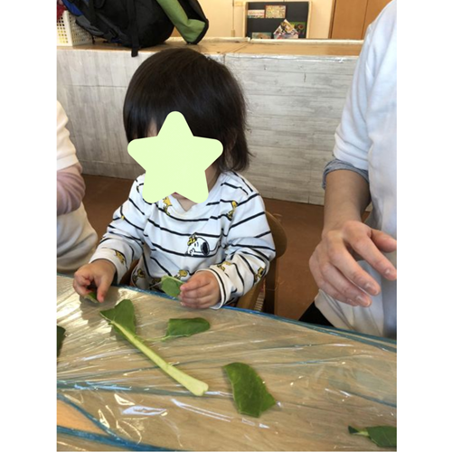 うさぎ組さんと(1歳児)とひよこ組さん(0歳児)合同で、ほうれん草、小松菜ちぎりをしました。・・・