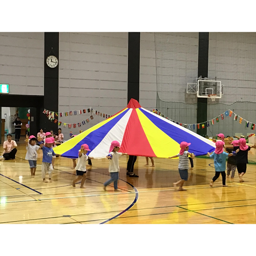 3・4歳児のみんなでパラバルーンの練習。運動会当日は広い体・・・
