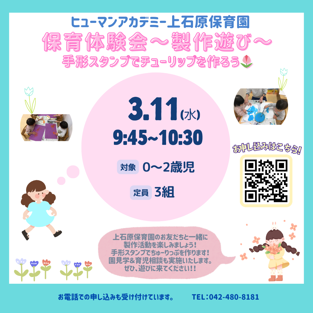 ヒューマンアカデミー上石原保育園【3月】~製作あそび体験!(乳児クラス一緒に手形スタンプでチューリップを作ろう)~
